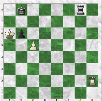 1...Rg6+ 2.c6 Rg8 3.Rh7 Rf8 4.Rb7+ Ka8 5.Ra7+ Kb8 6.c7+ Kc8 1–0