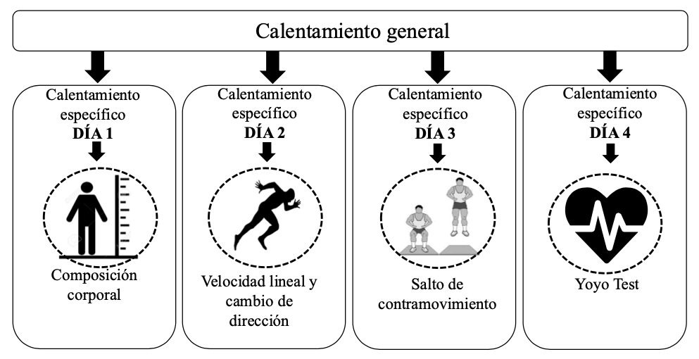 Los ejercicios de calentamiento fueron dirigidos por el entrenador de preparación física del club. Los participantes realizaron un calentamiento general estandarizado, que incluyó trote suave, movimientos multidireccionales y estiramientos dinámicos, seguido de un calentamiento específico para la prueba que duró de 15 a 20 minutos. Las diferentes pruebas fueron programadas de la siguiente manera: día 1: mediciones antropométricas. Día 2: tiempo para sprint de 10 m (10 m), 30 m (30 m) y 20 m de cambio de dirección (zigzag). Día 3: salto con contramovimiento (CMJ). día 4: prueba de recuperación intermitente yoyo nivel 1 (Yo-Yo IR1) (figura 1). estas pruebas son comúnmente realizadas por equipos de fútbol, ya que proporcionan datos válidos para evaluar la antropometría y la Aptitud física de los jugadores. Por lo tanto, todos los participantes estaban familiarizados con las pruebas y las realizaban regularmente. Se animó a cada jugador a dar su mejor esfuerzo en cada prueba (Pérez-Contreras et al., 2022; Villaseca-Vicuña et al., 2021). Para distribuir a los jugadores en las categorías de Bio-Banding (BB), en primer lugar, se estimó el momento de ocurrencia de la velocidad pico de altura (VPA) con las mediciones de altura, peso y altura sentado, utilizando la ecuación de regresión presentada por Mirwald et al. (2002). Posteriormente, se predijo la altura adulta con el modelo de Sherar et al. (2005), una vez establecida la altura adulta predicha, junto con el respectivo porcentaje actual de altura adulta, los participantes fueron distribuidos en cuatro categorías de BB (Rogol et al., 2018): < 85.0% (BB1); 85.0 – 89.9% (BB2); 90.0 – 94.4% (BB3) y ≥ 95.0% (BB4), que representan las etapas prepuberal, puberal temprana, puberal media y puberal tardía, respectivamente (Cumming et al., 2017b). La tabla 2 muestra el número de jugadores en cada categoría BB según criterios cronológicos. Figura 1. Distribución de las evaluaciones antropométricas y de Aptitud física